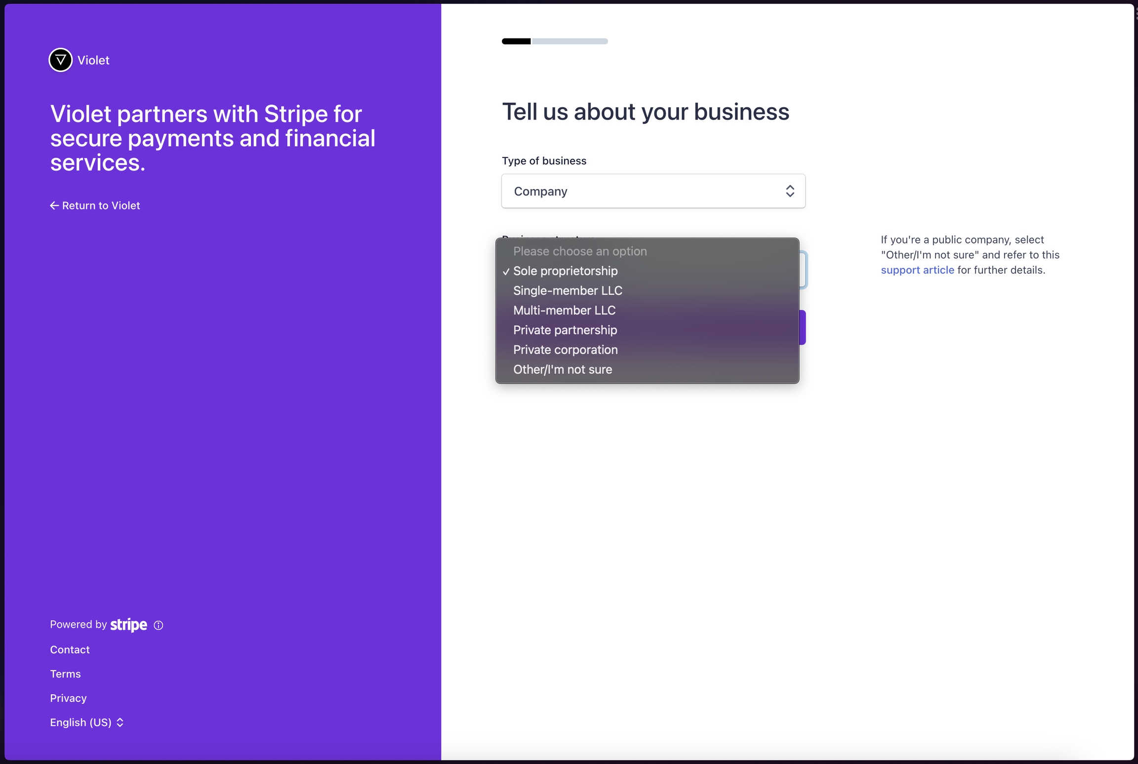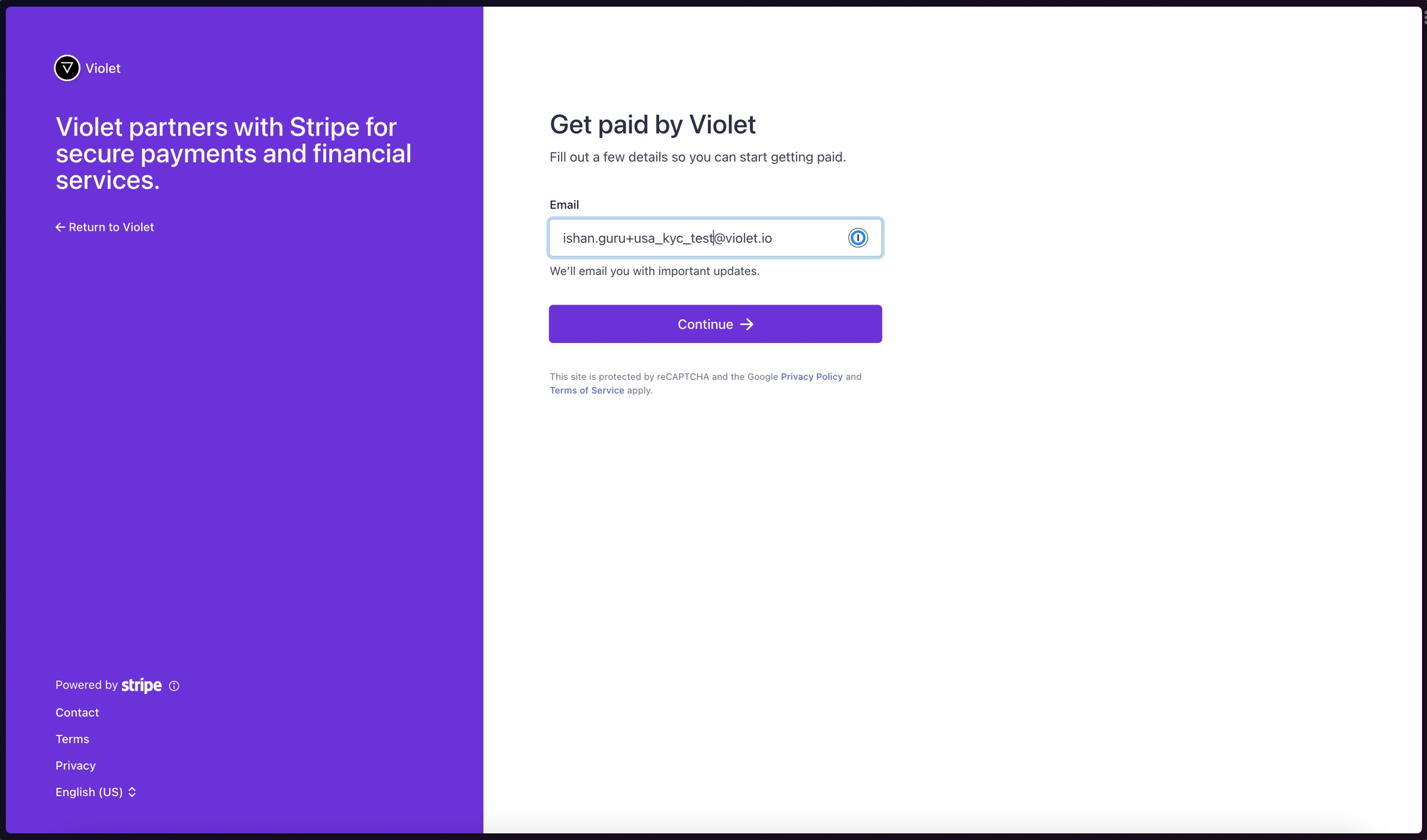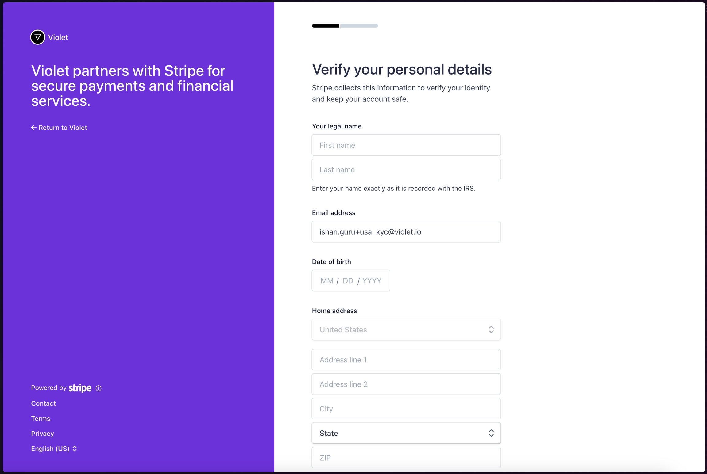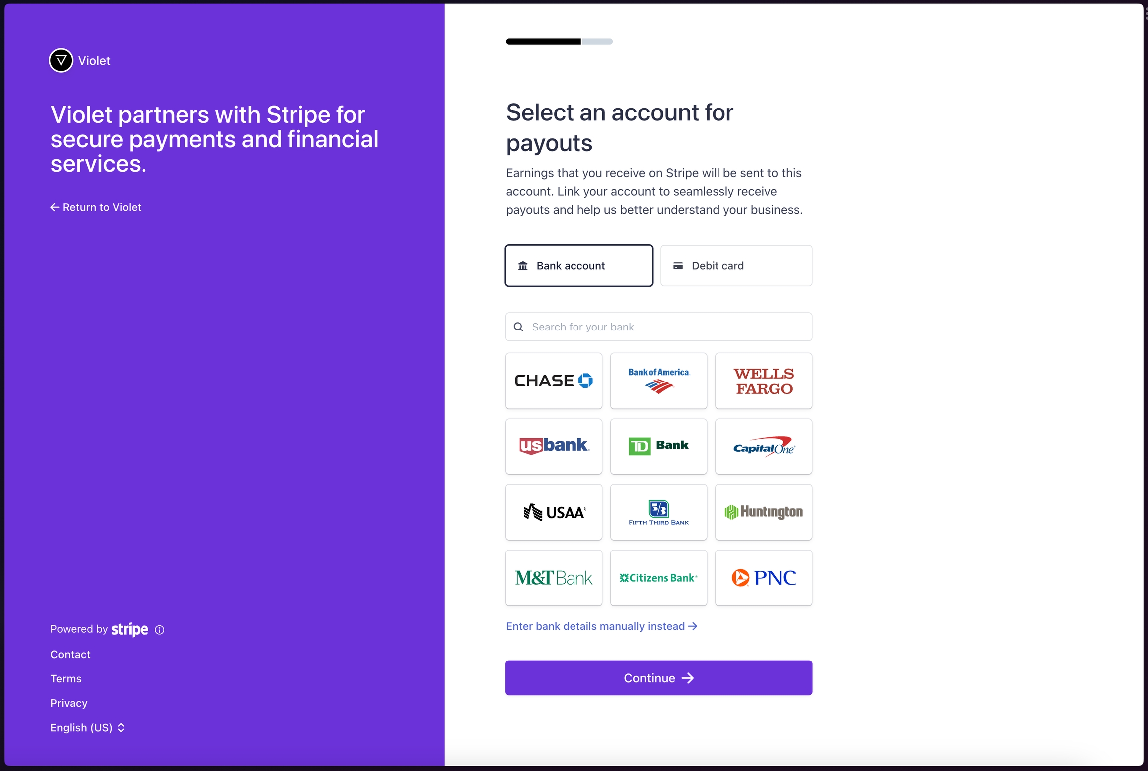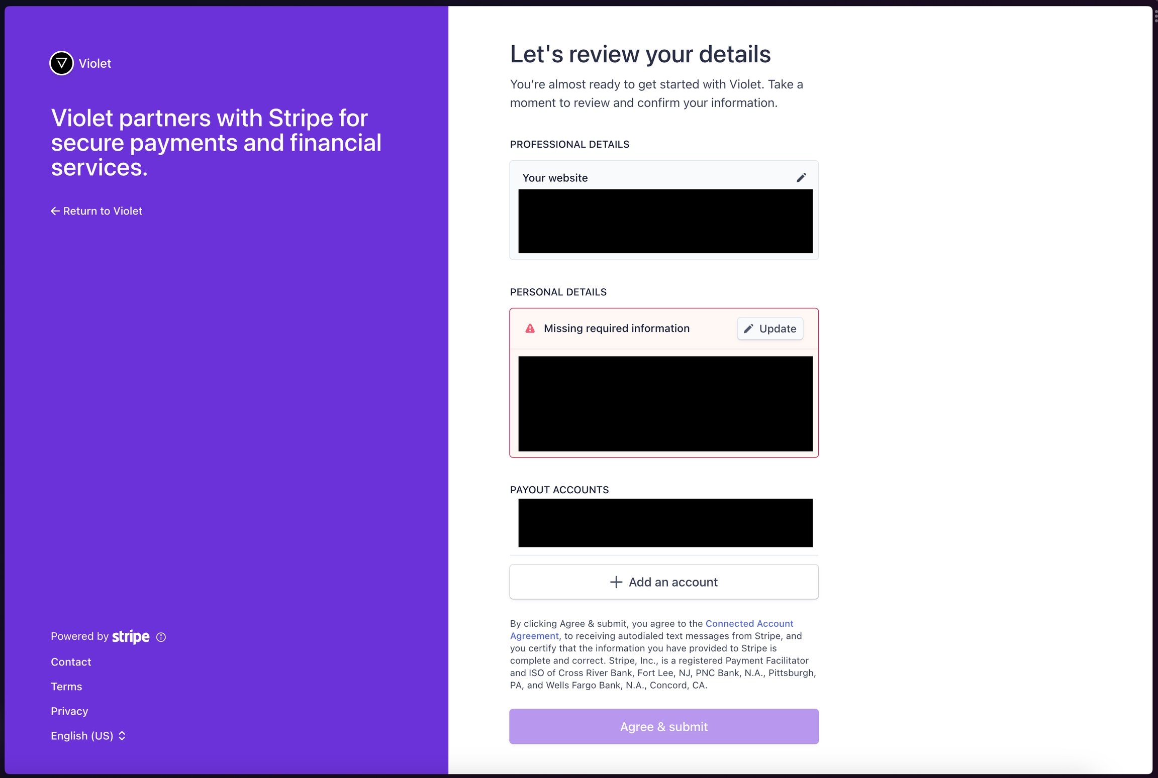 Violet specifically uses Stripe Express to ensure that Stripe handles the onboarding and provides you with the ability to control your own payout schedules and connected bank accounts. This information never leaves Stripe and this account is only used by Violet for payouts. Violet does not currently support linking existing Stripe accounts and the Stripe Express account is not a “full” business Stripe account. The benefit of this flow vs. a full Stripe onboarding flow is that the KYC process is much simpler than onboarding with a full business Stripe account.