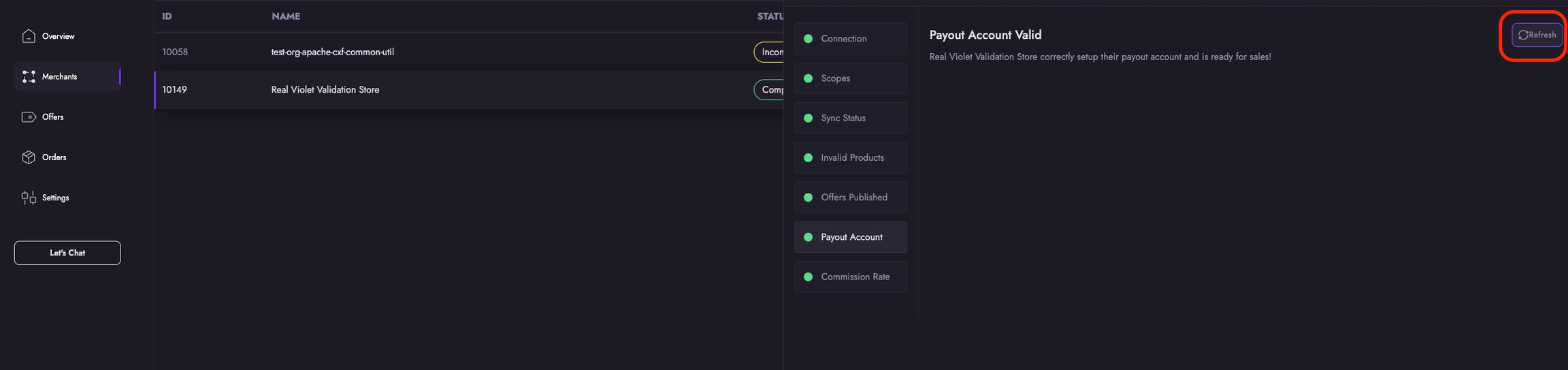 After your merchant has completed this flow and submitted all their information, you can go to the merchants tab in your Channel Dashboard and verify that the payouts tab is marked as complete. Please note that it can sometimes take Stripe a few minutes or in rare cases even hours to process the information. You can use the refresh button to monitor updates.