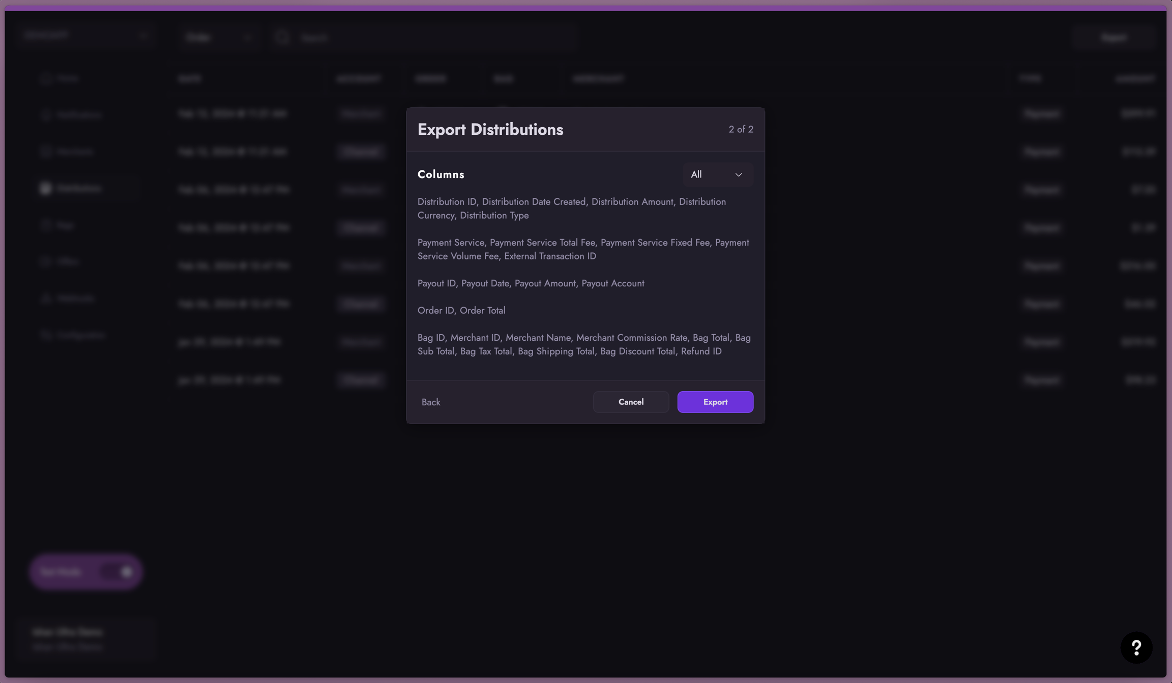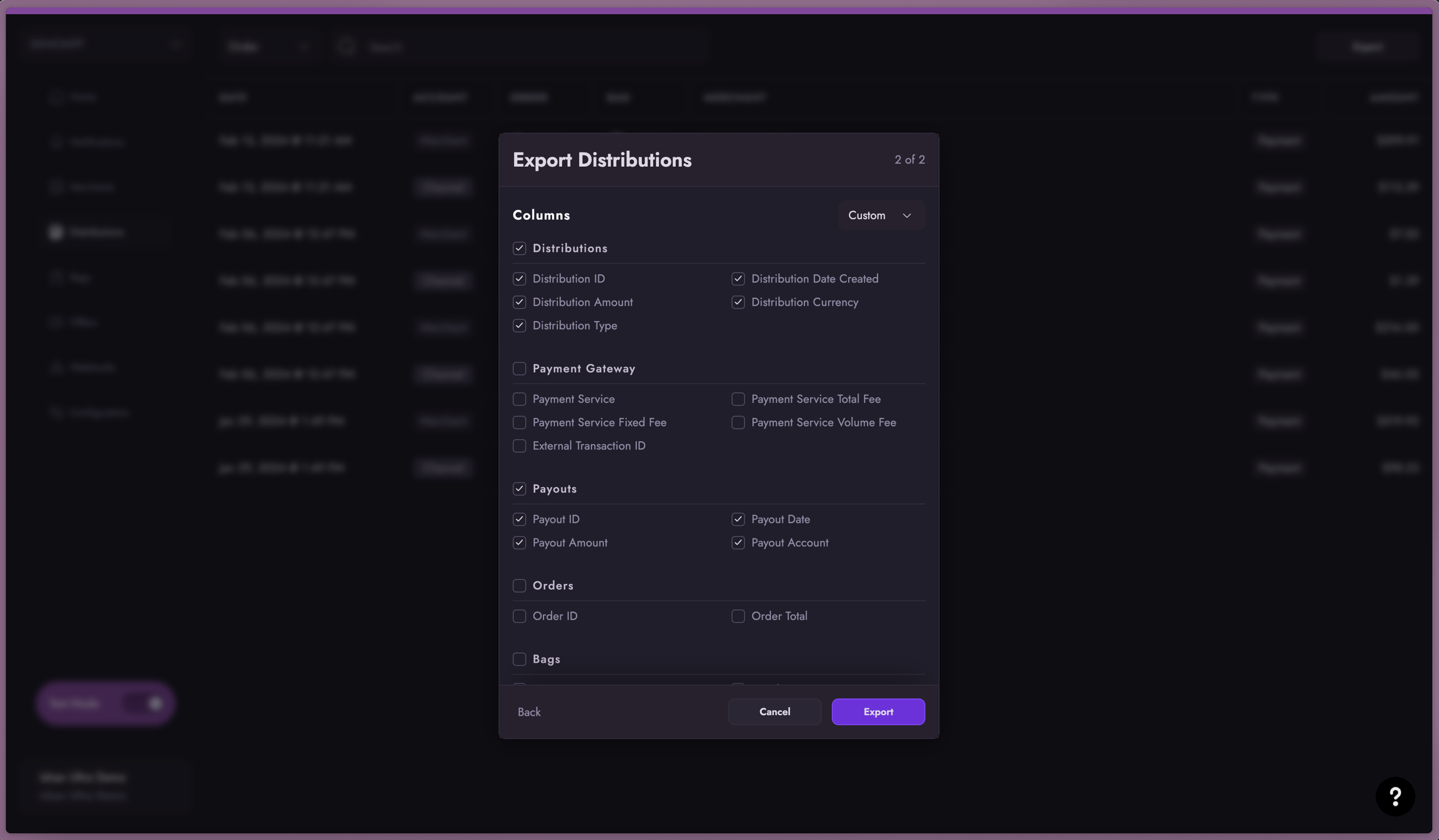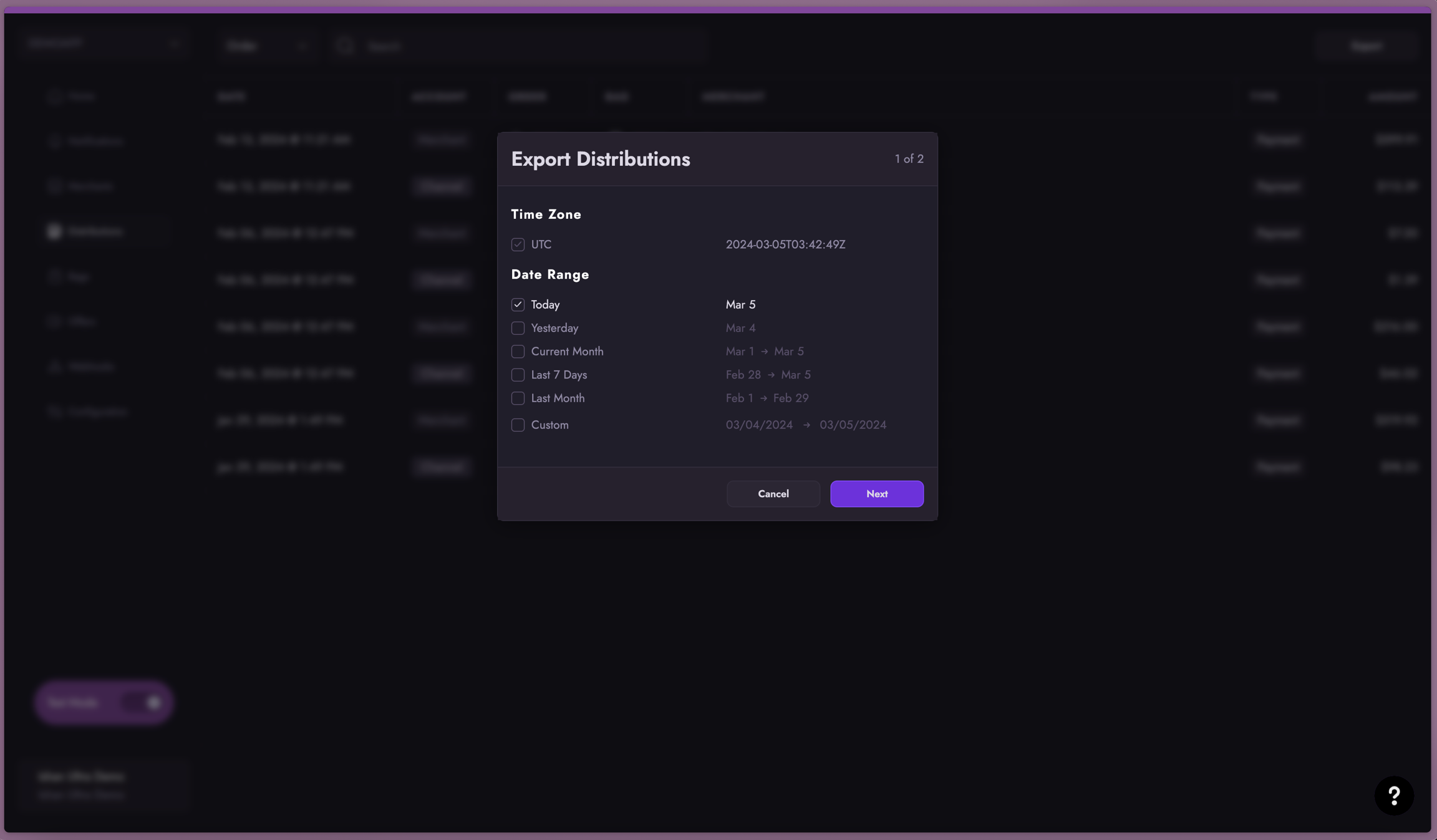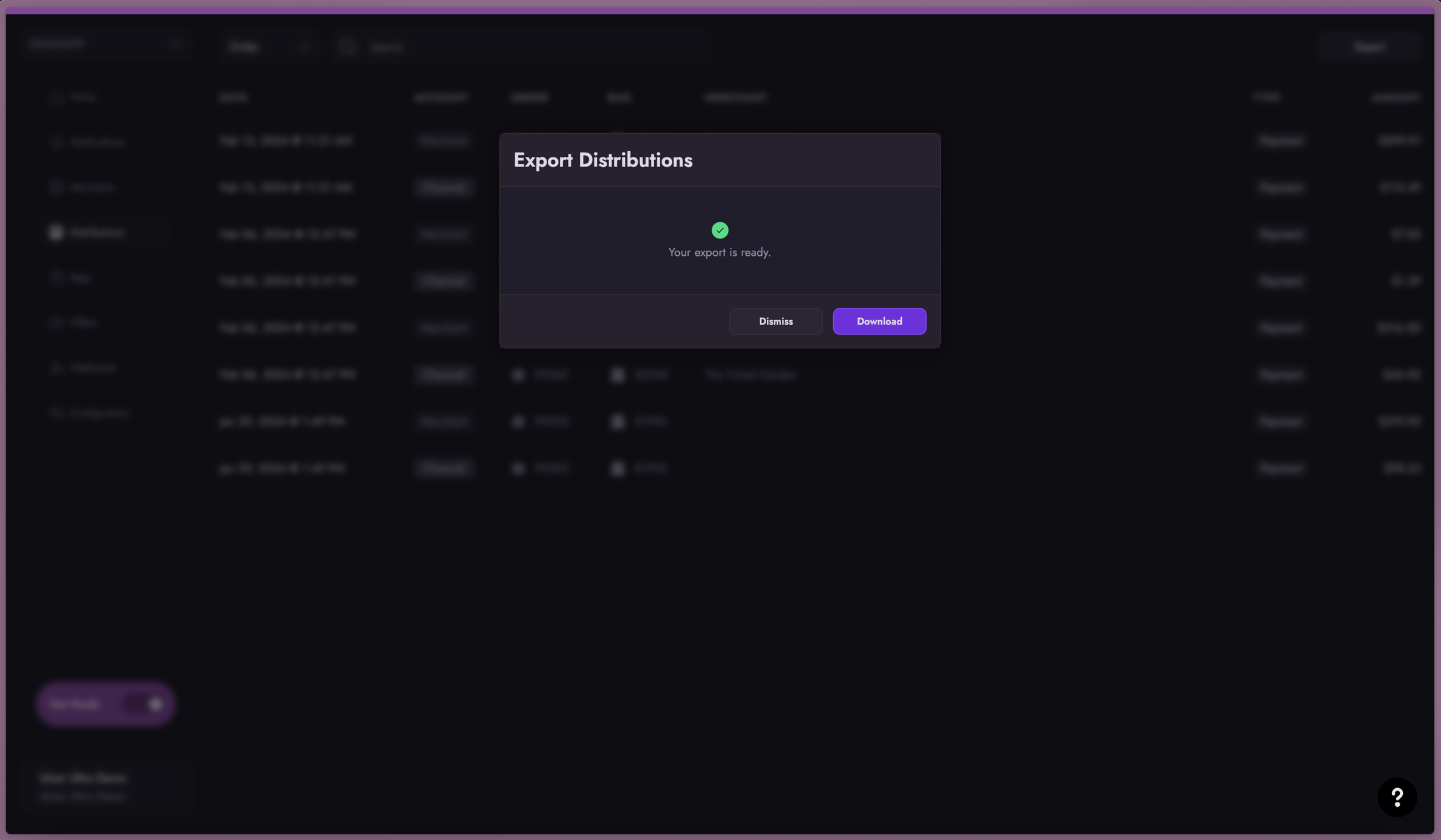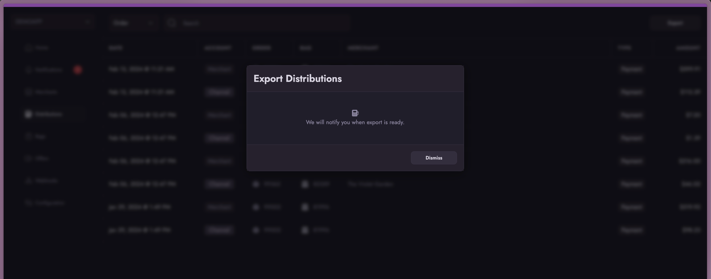 Exporting Distributions lets you access information that is not present in the dashboard by default, such as additional columns and filtering by specific date ranges. You can export Distributions to your local computer in the form of a CSV file to use in Excel or any other spreadsheet software.