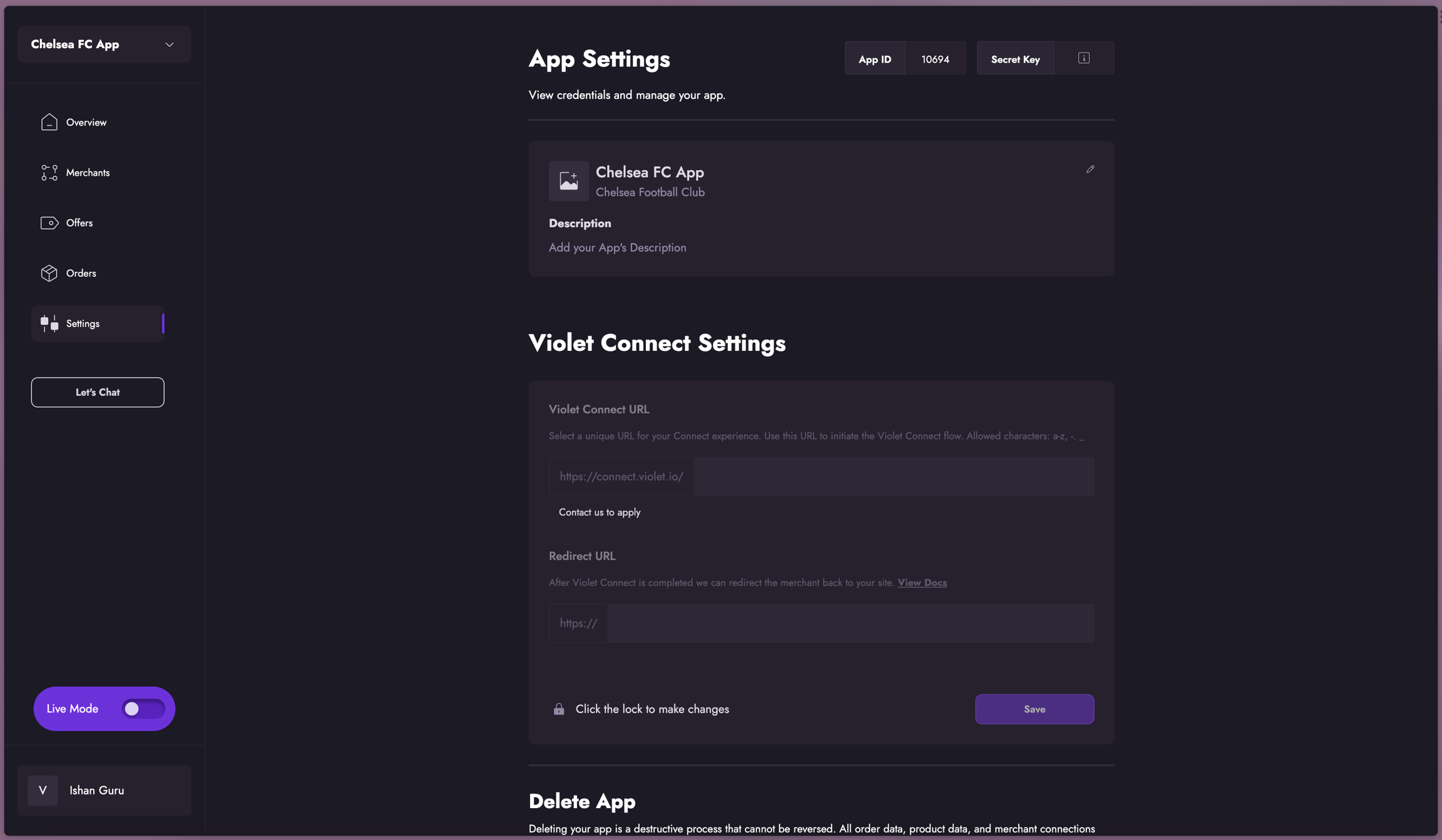 The Settings tab lets you manage your App and Violet Connect Settings.