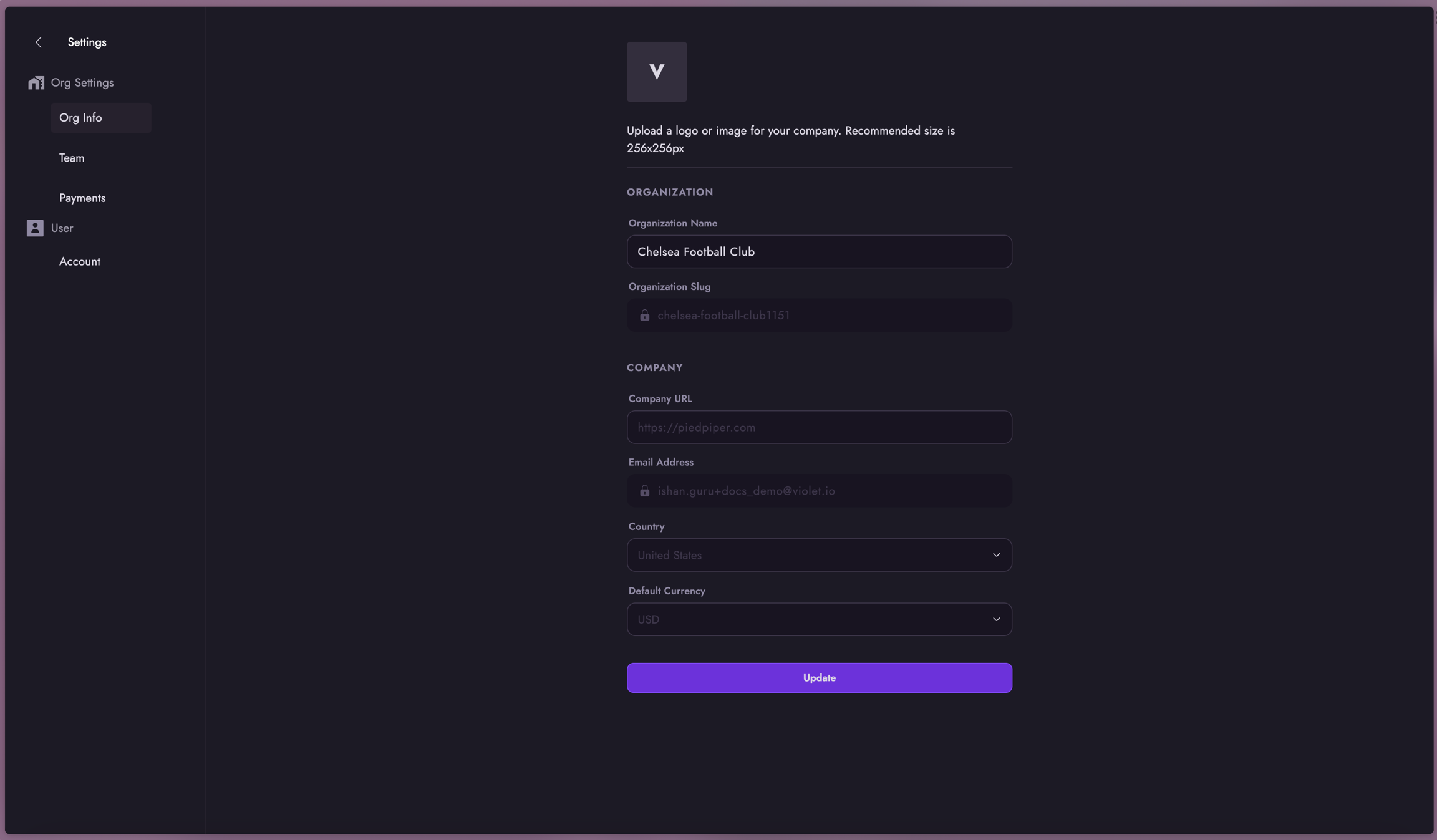 You will then be prompted to “Create an Organization”. This is top-level relationship with Violet. Violet allows you to have per user controls for our dashboards tied to your organization.