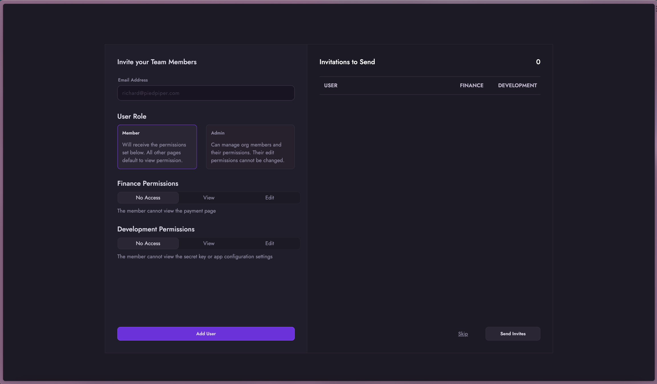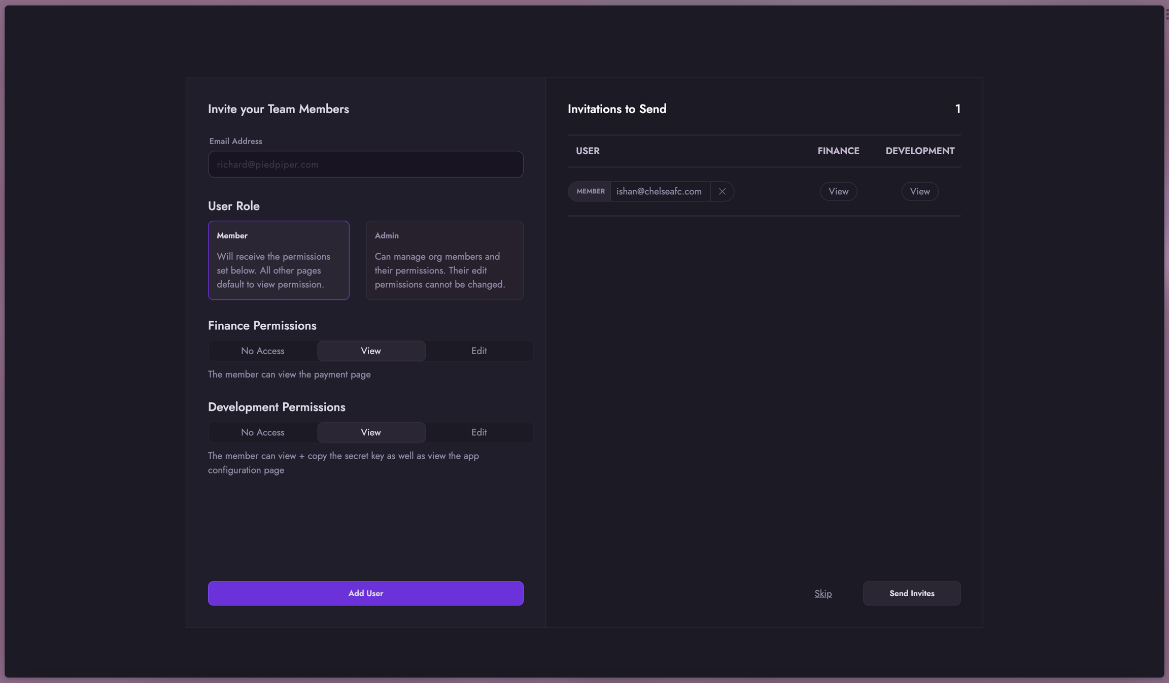 Invite users in your company that you would like to provide dashboard access to. You can control what level of access they should have based on permissions. You can skip this step and come back to it later.