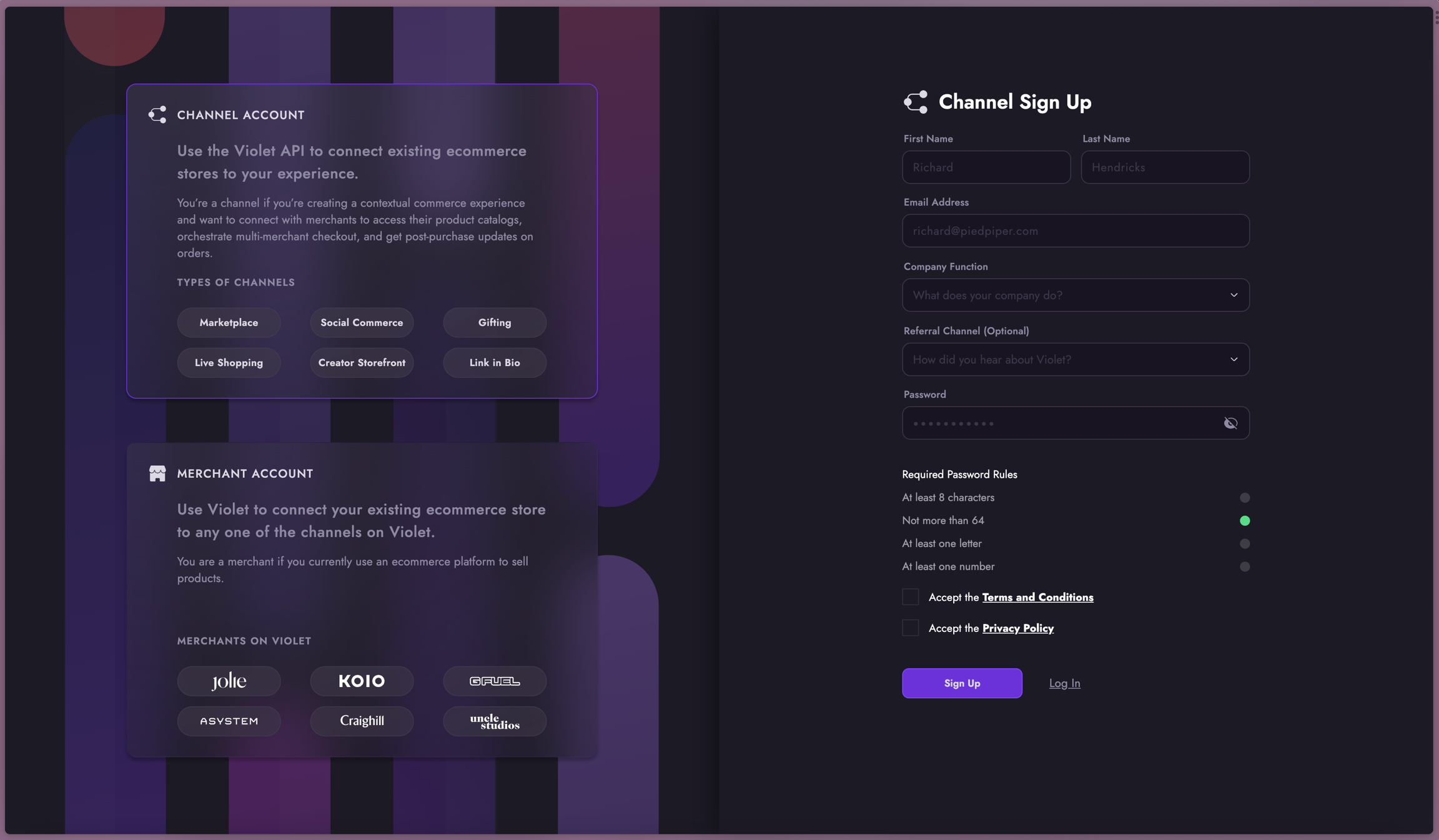 To sign up for the Channel Dashboard, you can go to channel.violet.io/signup and follow the prompts, as seen in the steps below: