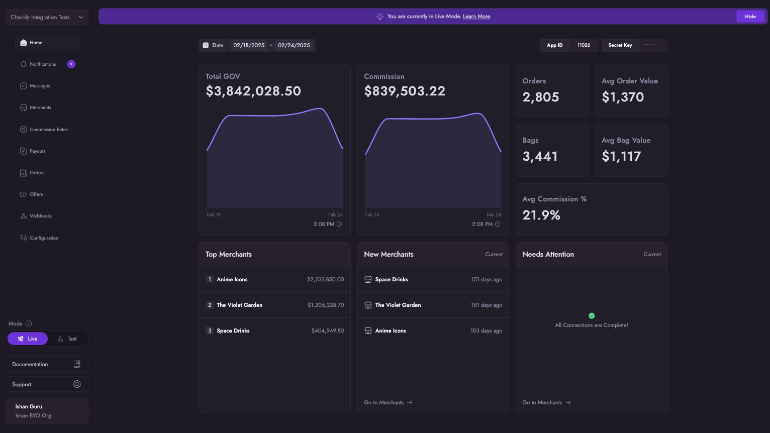The Overview section displays your App credentials along with an analytics dashboard that provides insights into orders, merchant data, revenue, and other key business metrics.