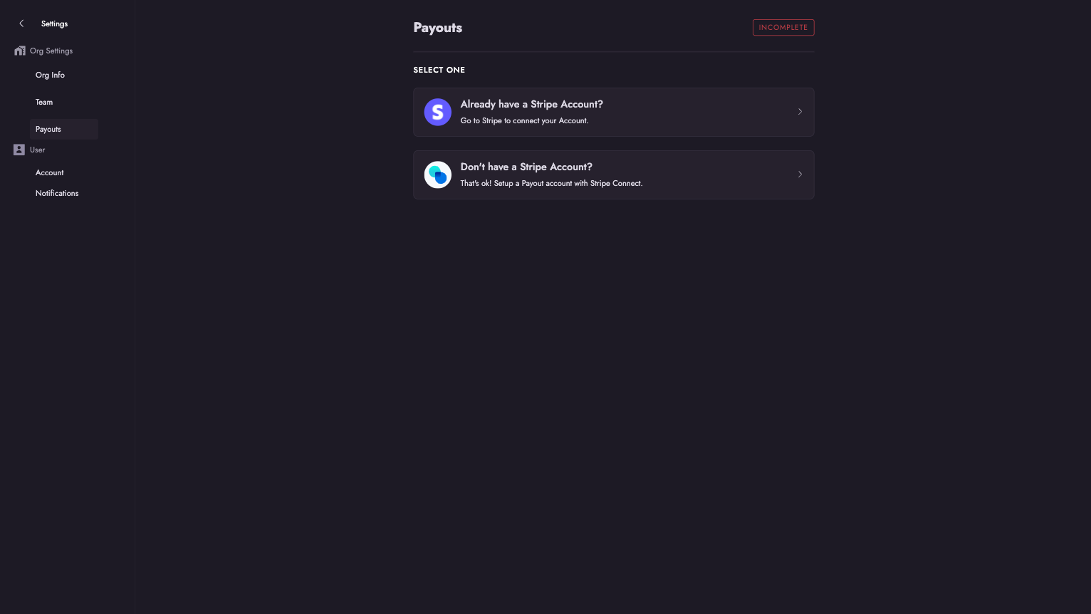 If you are a channel using Violet Payments, this section will appear as "Payouts" in your dashboard. Violet handles all fund disbursement through your connected Stripe account. You can access your Stripe dashboard directly using the "Go to Stripe" button.