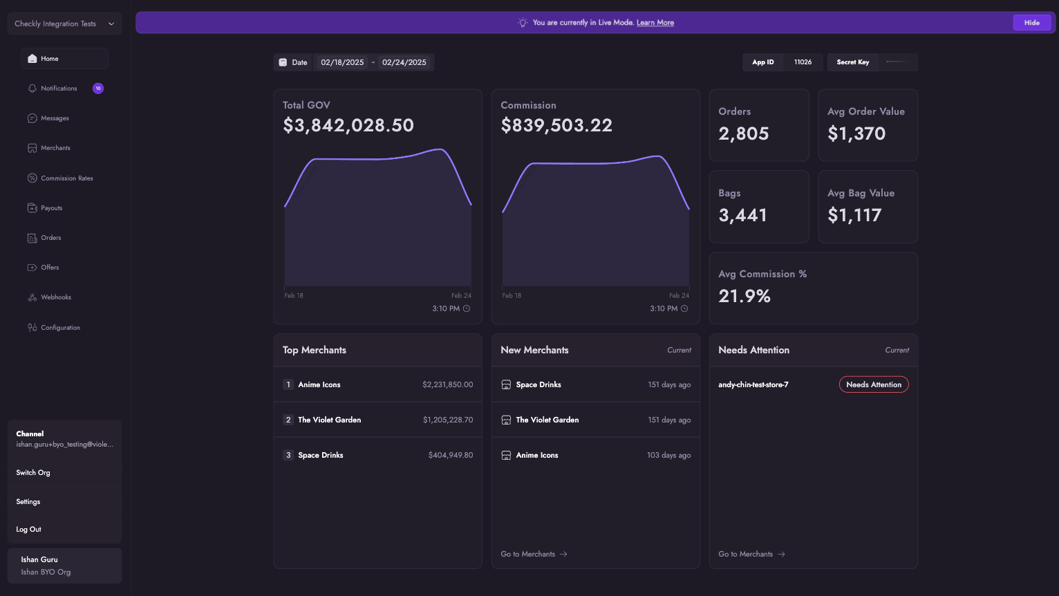 The Violet Channel Dashboard lets you sign up and create applications to get API keys, review the state of your connected merchants, and configure your applications.