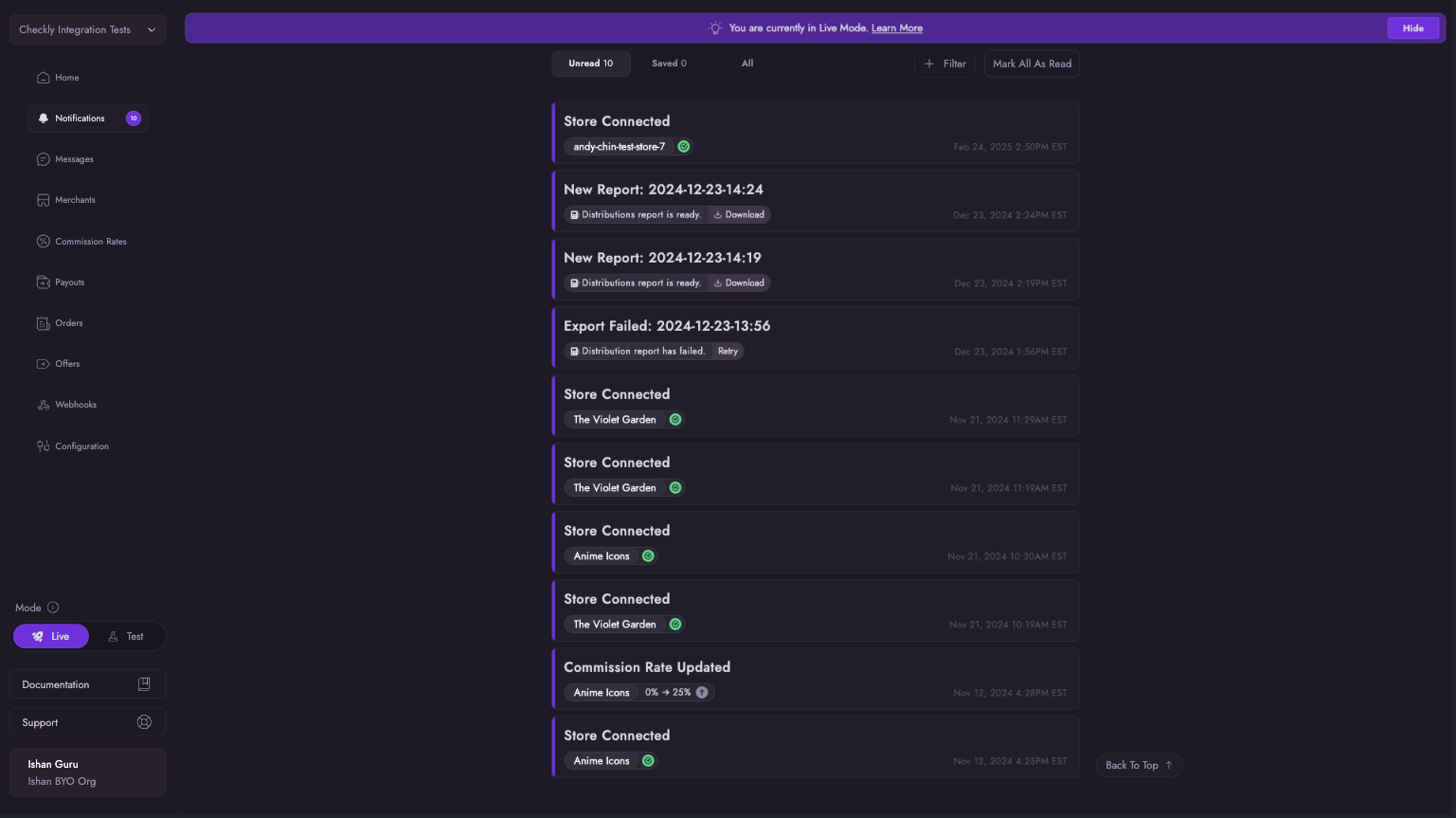 The Notifications tab helps you manage and track important updates about your connected merchants and application. You can: