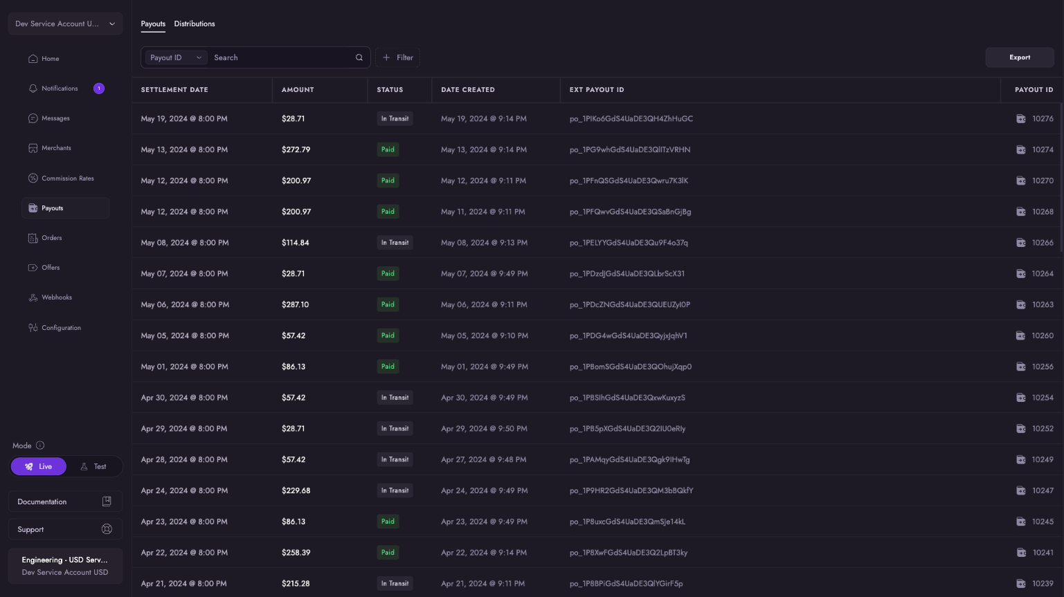 The Payouts tab displays all financial transactions related to your orders. Each payout entry includes: