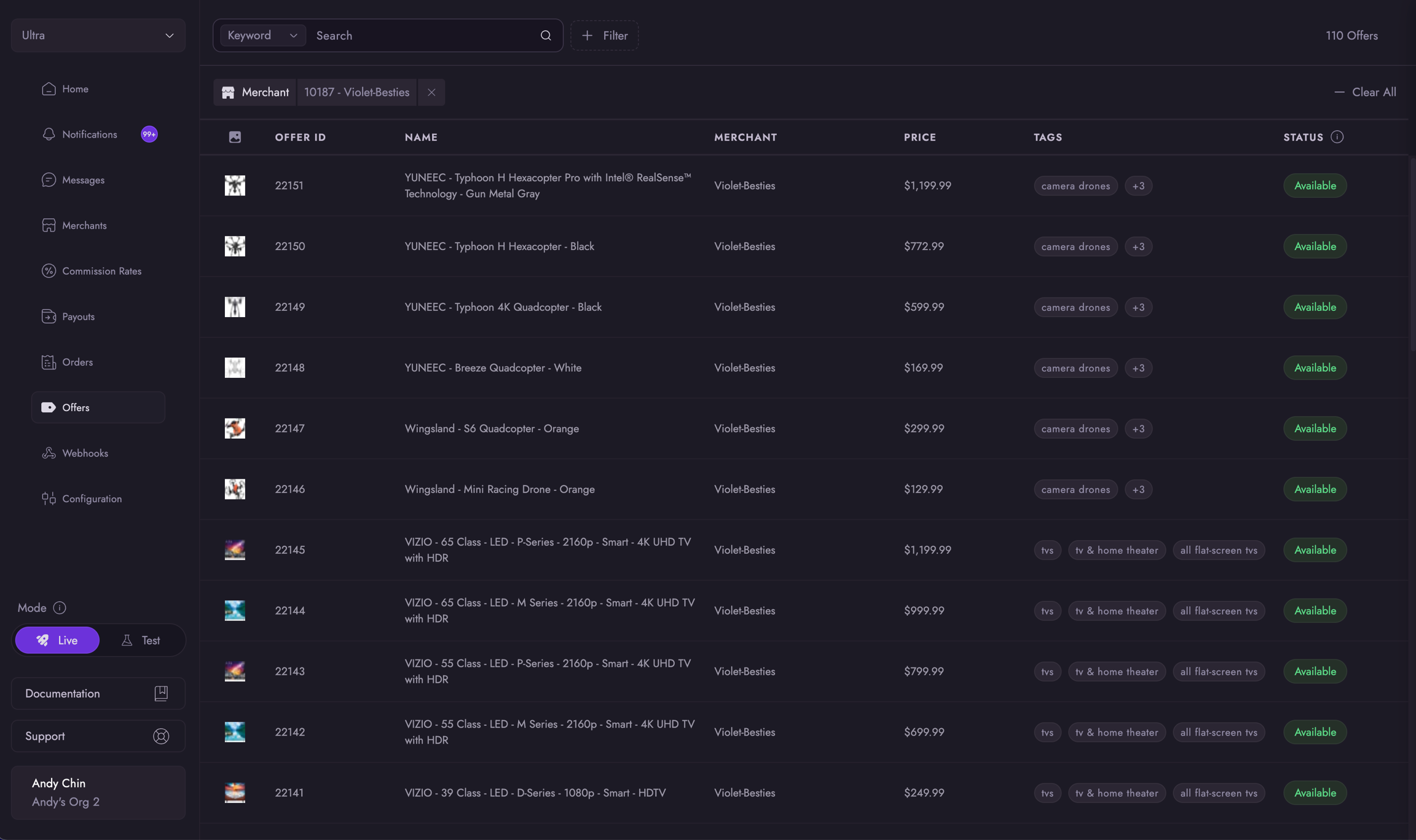 Once connected to Merchants, all your Merchant Offers will appear here. A sample page from a Violet Demo account can be seen below: