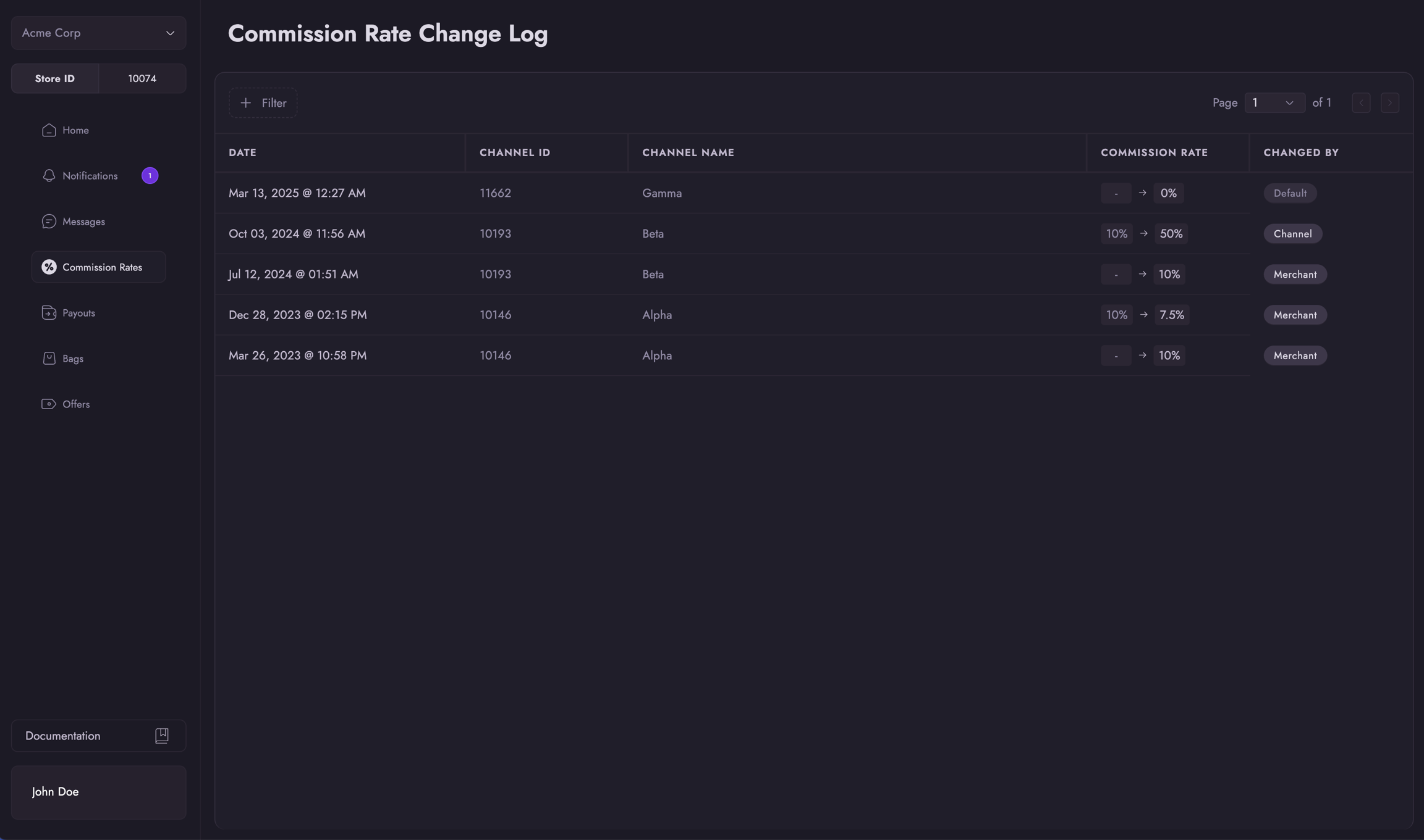 The Commission Rates tab displays historical commission rate changes for the merchant's connected apps. You can: - View a chronological log of all rate changes - Filter changes by specific channels