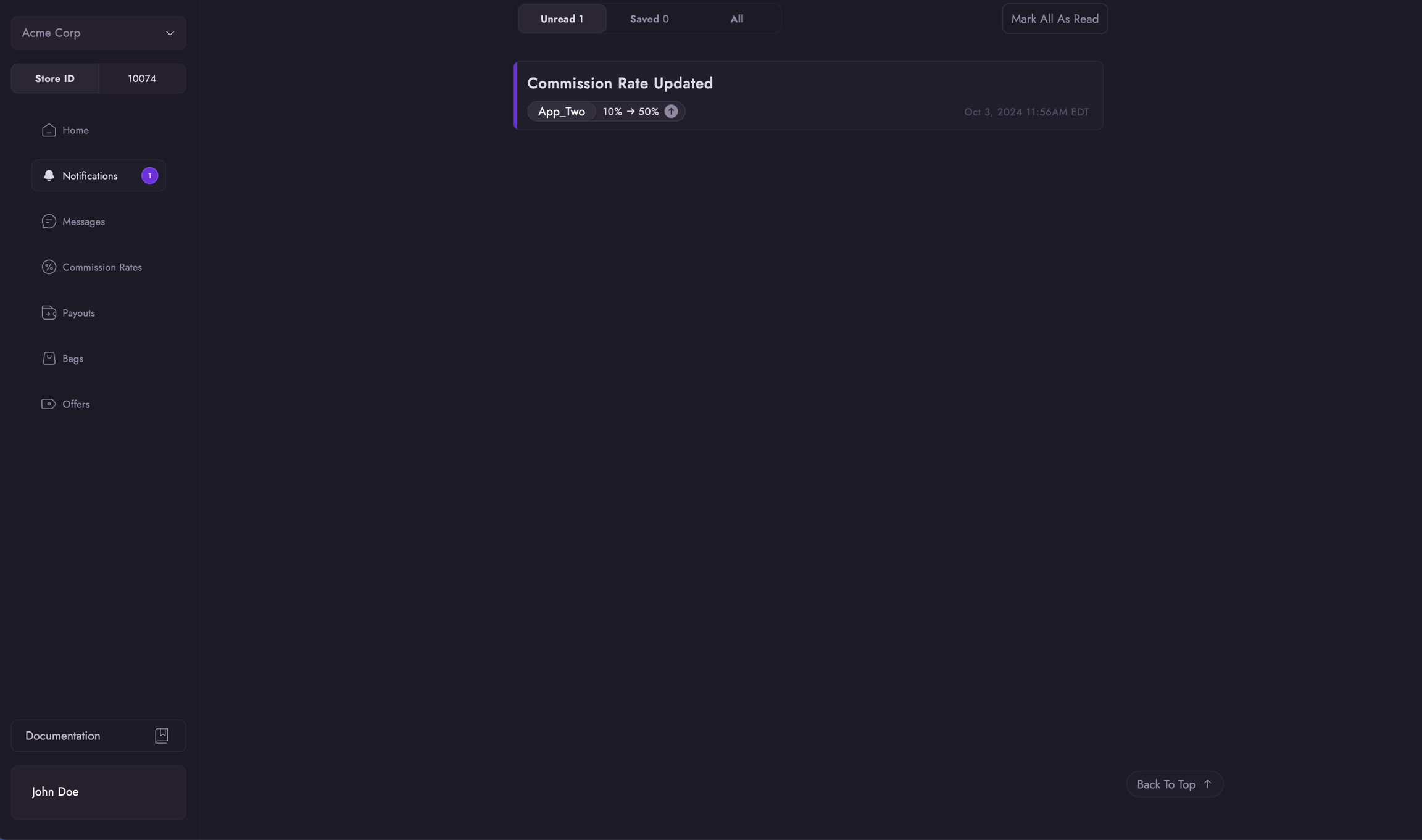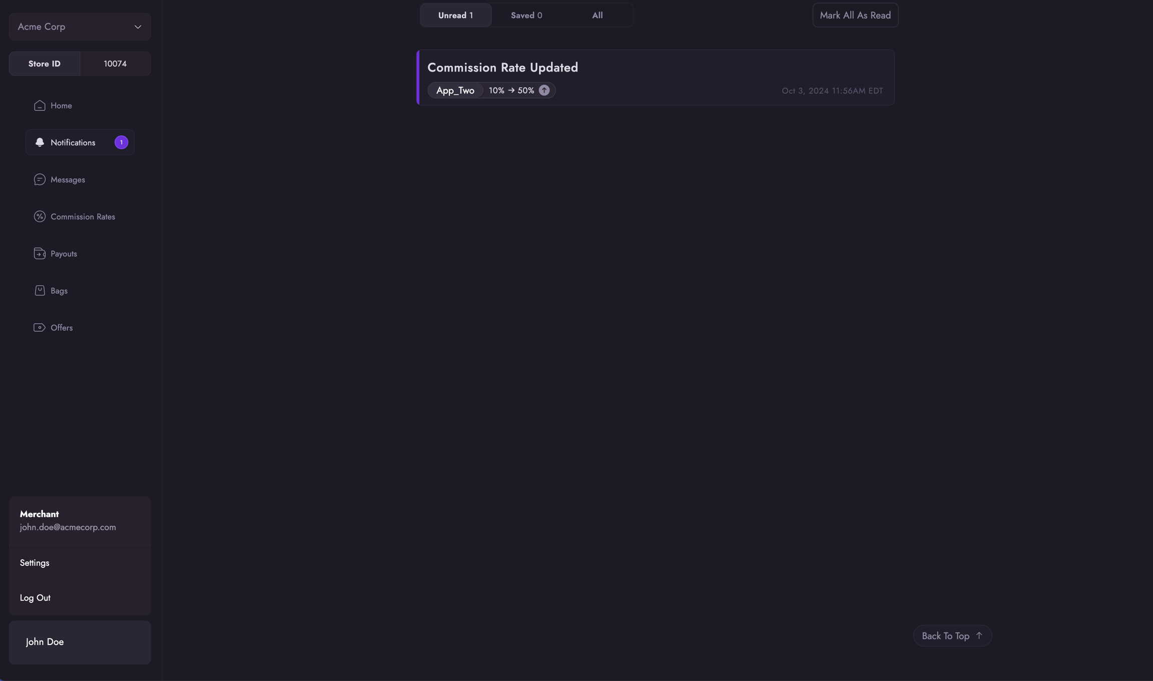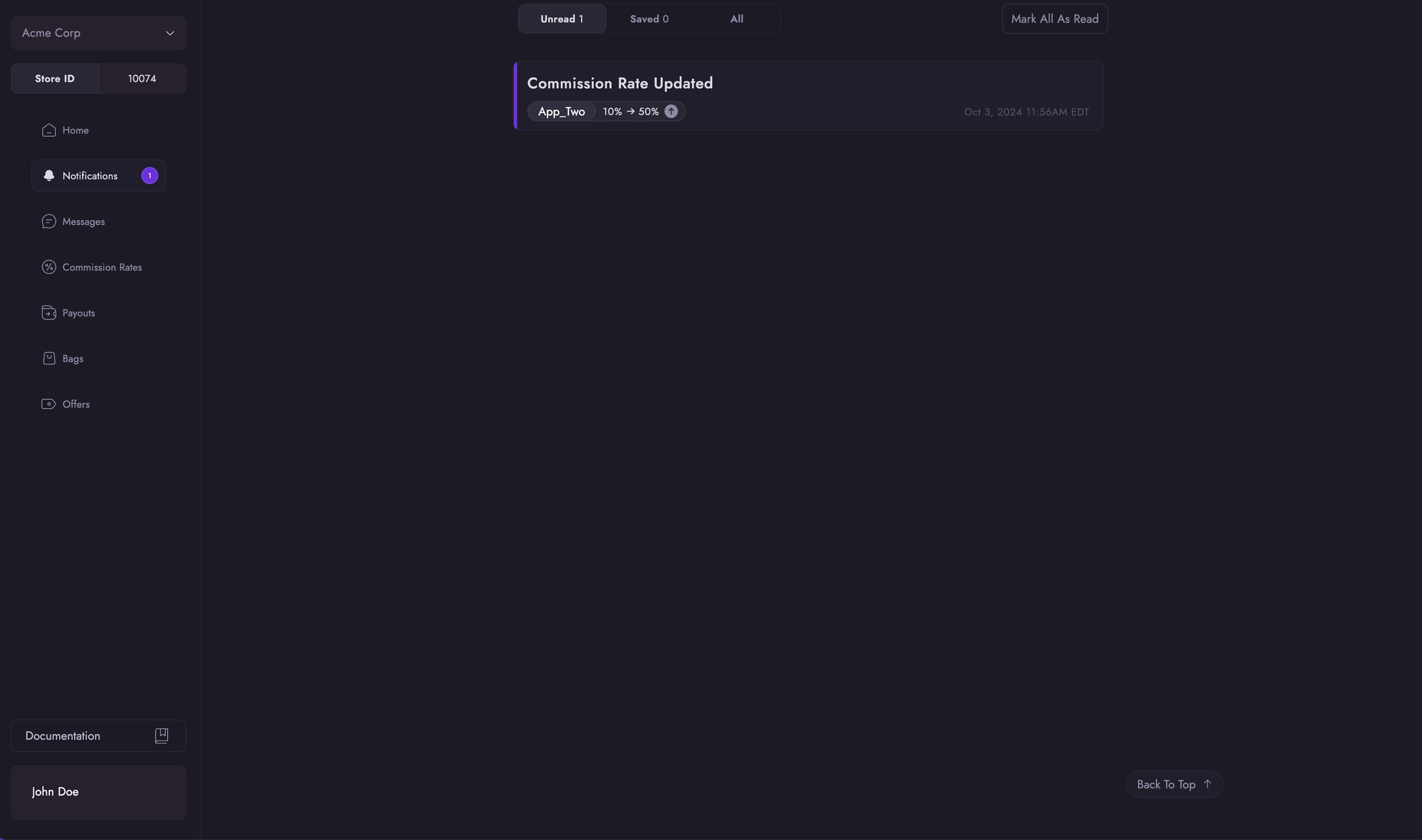 The Notifications page is where merchants can manage all the notifications that they have received such as from completed report notifications and commission rate updates.
