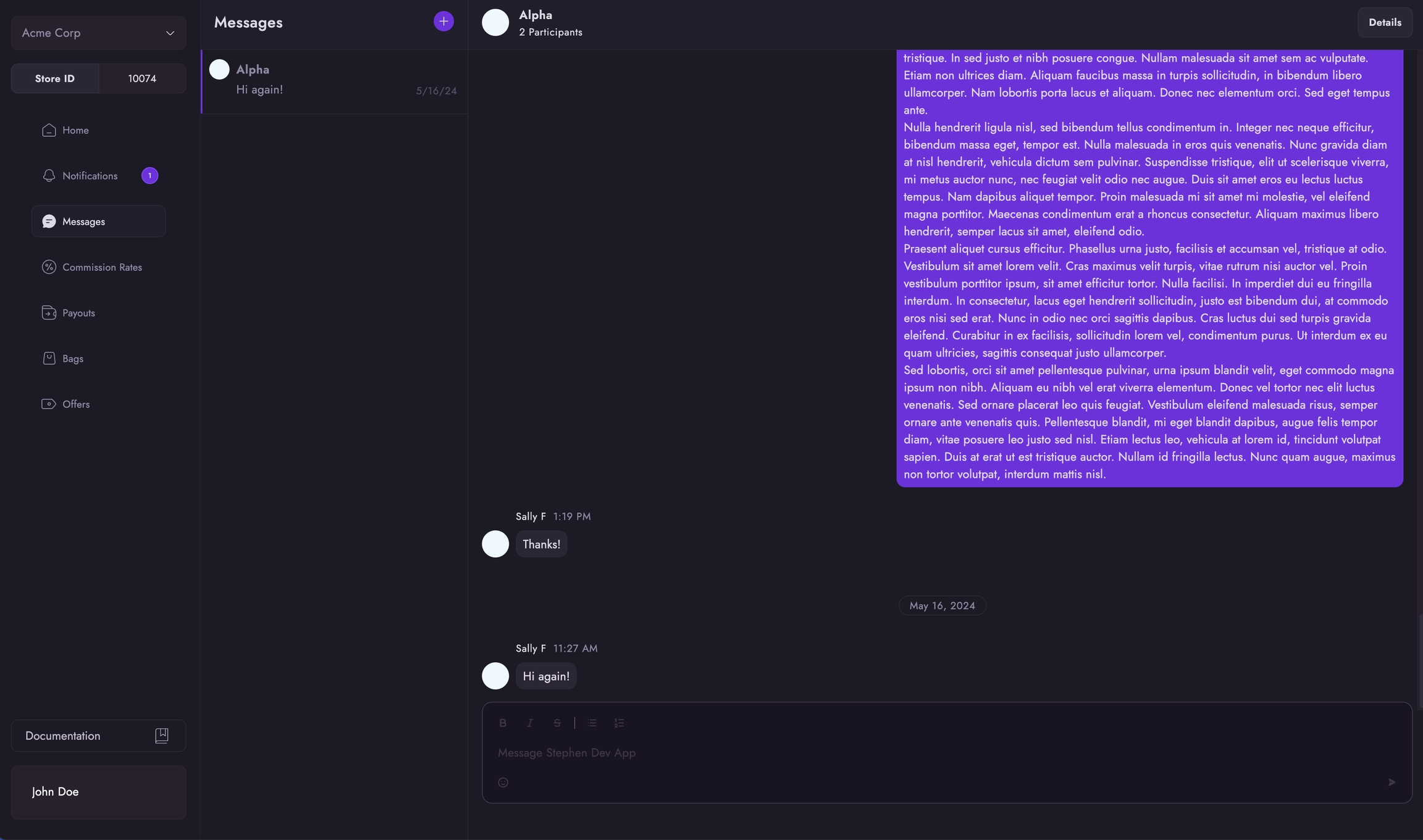 The Messages tab enables direct communication with your connected channels. From here, you can initiate and manage conversations with channels in real-time.