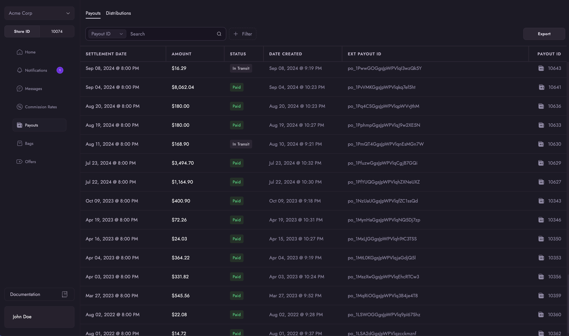 The Payouts page is merchants can see all the financial transactions related to their orders. Each payout entry includes: - A detailed summary of the transaction - Related distribution records - Transaction status and timeline - They can also access a dedicated Distributions tab for a more comprehensive view of money earned across orders.