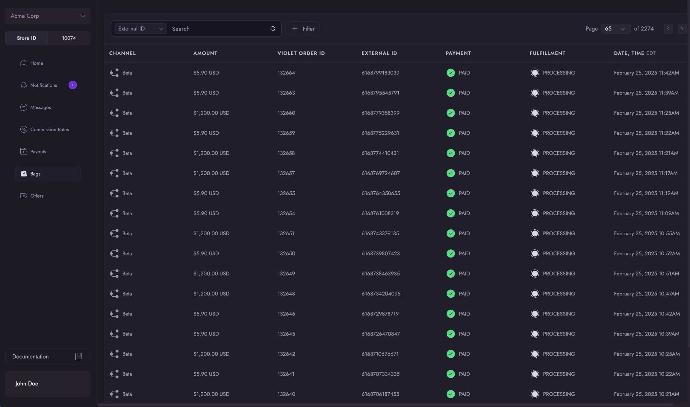 The Bags dashboard is where they can see all orders that have been placed through their integrations with Violet, including the state that they are in.