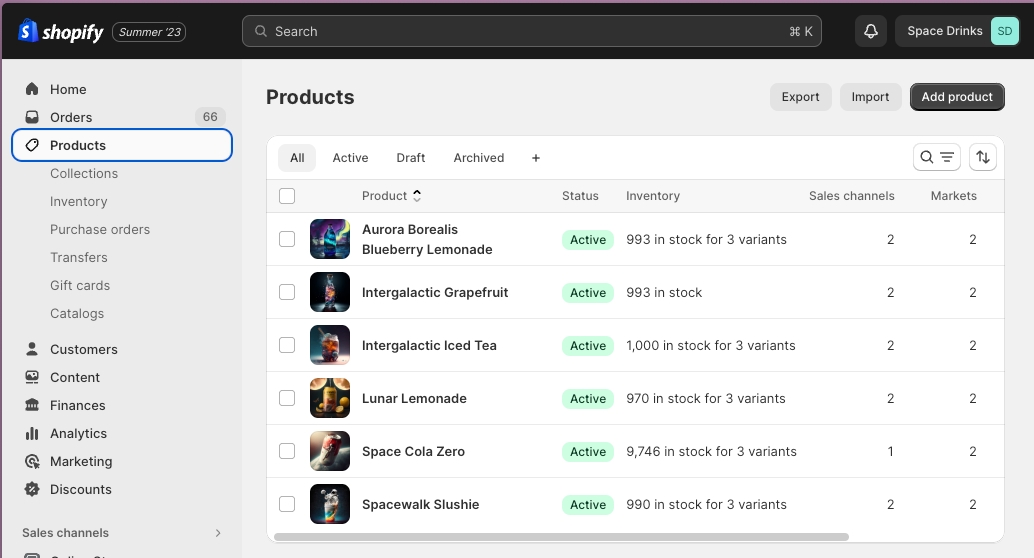 If you don’t already have one, you can create a store on Shopify by following clicking here. Shopify will take you through creating an account, creating a store, and then uploading products. Once your store is ready, you should be able to navigate to the Products tab and see your list of products. Your Shopify merchants will have a similar view of products. These are what get synched into Violet during onboarding